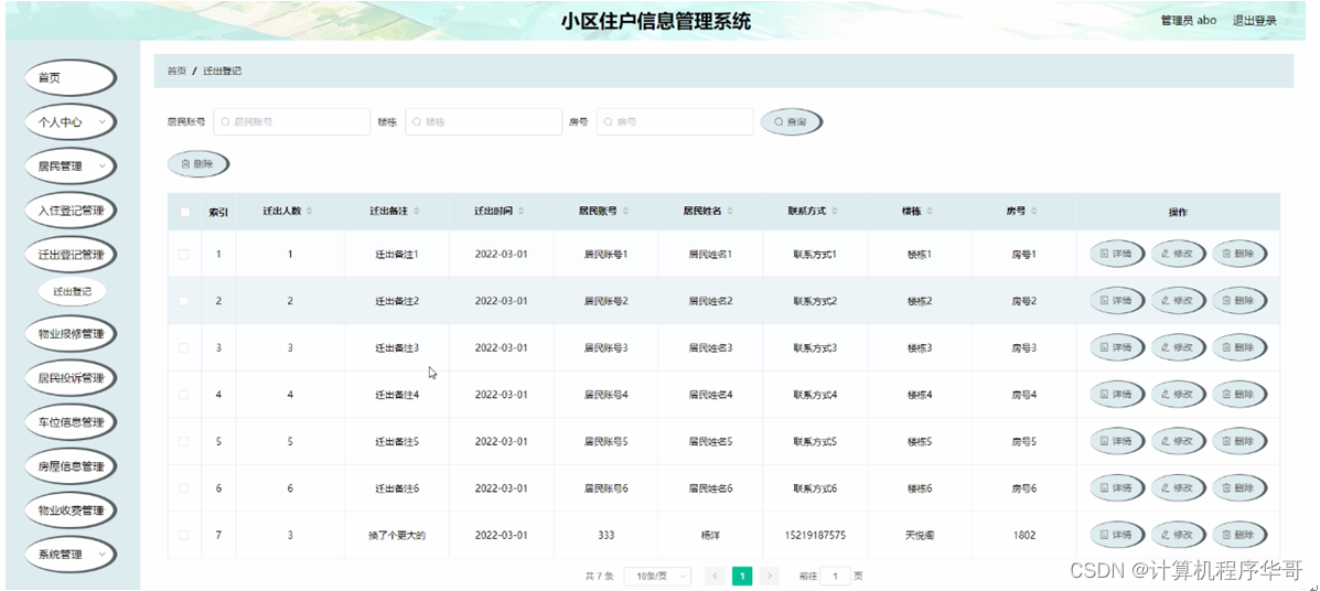 迁出登记管理,管理员可在迁出登记管理页面查看迁出人数、迁出备注、迁出时间、居民账号、居民姓名、联系方式、楼栋、房号等内容,还可进行新增、修改或删除等操作,如图5-5所示。