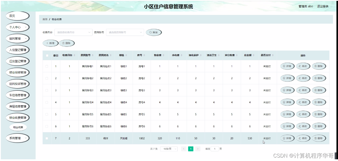物业收费管理,管理员可在物业收费管理页面查看收费月份、居民账号、居民姓名、楼栋、房号、物业费、水电费、绿化养护、清洁卫生、其他收费、总金额、是否支付等内容,还可进行新增、修改或删除等操作,如图5-10所示。