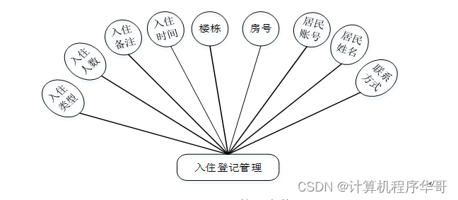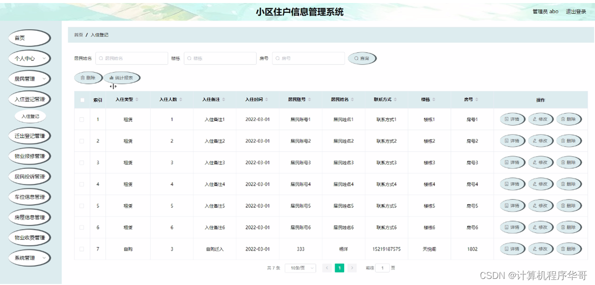 入住登记管理,管理员可在入住登记管理页面查看入住类型、入住人数、入住备注、入住时间、居民账号、居民姓名、联系方式、楼栋、房号等内容,还可进行新增、修改、统计或删除等操作,如图5-4所示。