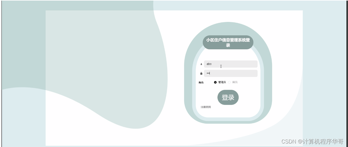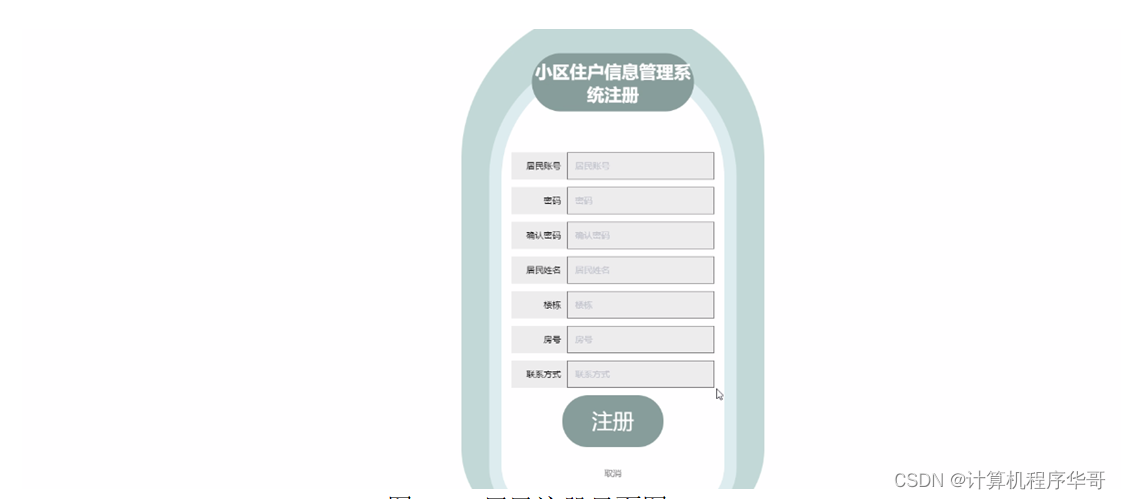 居民注册,居民通过输入居民账号、密码、居民姓名、楼栋、房号、联系方式等内容进行注册,如图5-12所示。