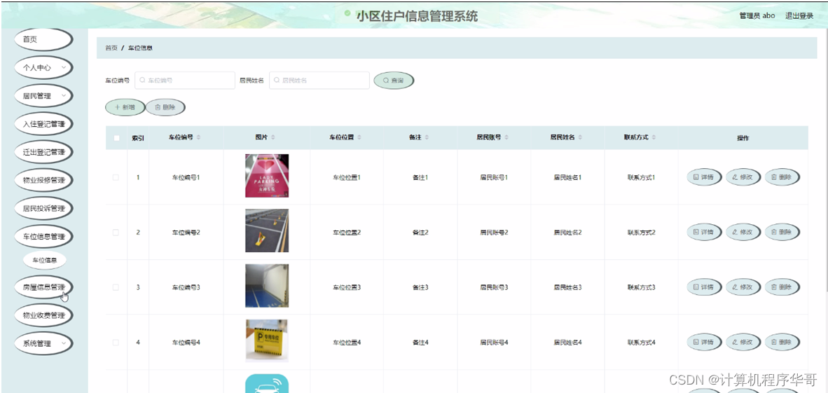 车位信息管理,管理员可在车位信息管理页面查看车位编号、图片、车位位置、备注、居民账号、居民姓名、联系方式等内容,还可进行新增、修改或删除等操作,如图5-8所示。