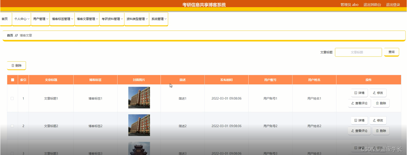 博客文章管理:在博客文章管理页面,可以对文章标题、博客标签、封面图片、简述、发布时间、用户账号、用户姓名等内容进行详情、修改、删除等操作,如图5-5所示: