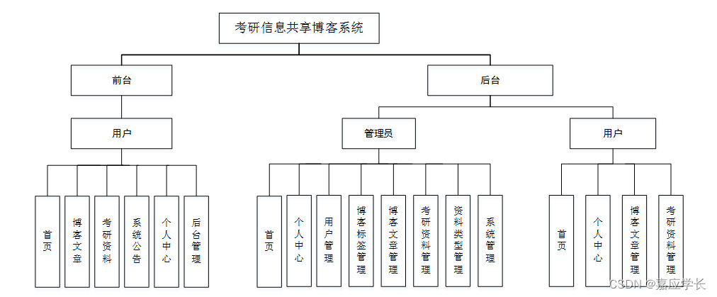 管理员功能:管理员登录系统后,能对首页、个人中心、用户管理、博客标签管理、博客文章管理、考研资料管理、资料类型管理、系统管理进行操作。管理员功能如下图5-2所示: