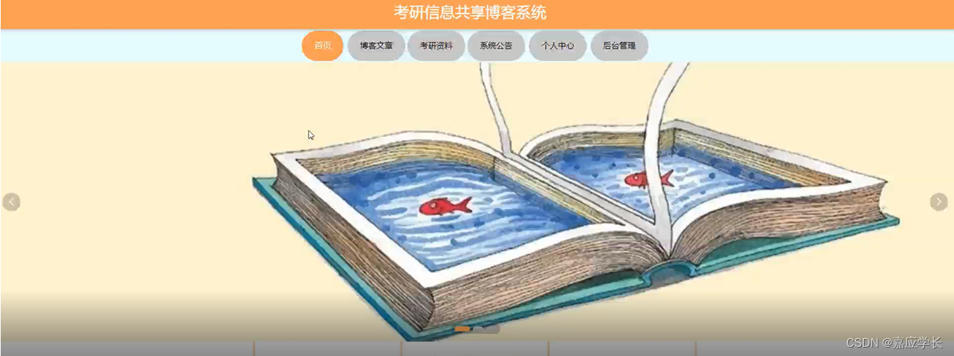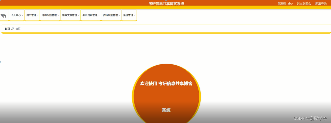 用户登录到系统前台,可以对首页、博客文章、考研资料、系统公告、个人中心、后台管理等进行相应操作,如图5-10所示: