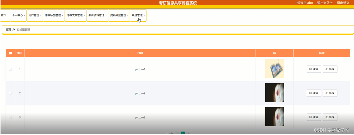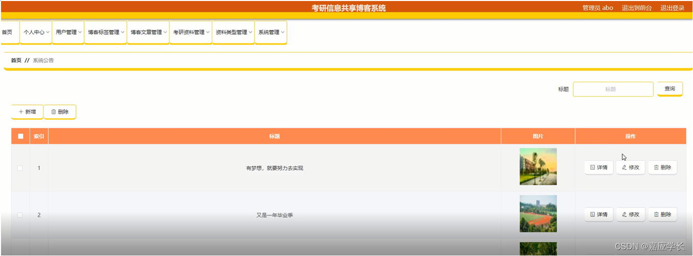 系统管理:管理员通过系统管理页面查看轮播图管理、系统公告等进行前台上传图片,系统公告发布,进行添加、删除、修改以及查看并对整个系统进行维护等操作,如图5-8 5-9所示: