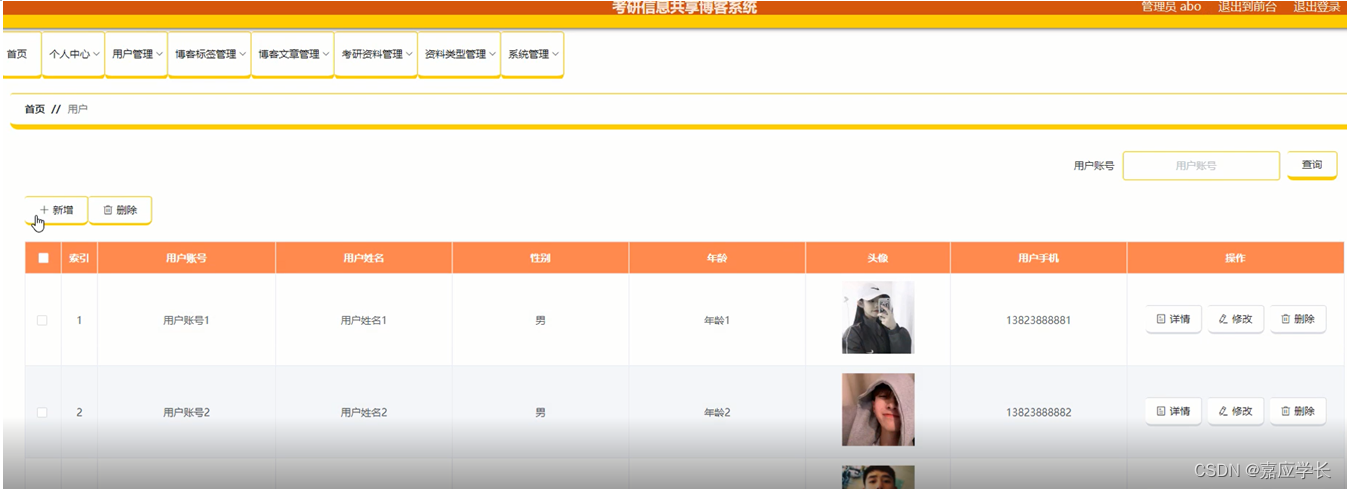 用户管理:在用户管理页面,可以查看用户账号、用户姓名、性别、年龄、头像、用户手机等信息进行详情、修改、删除等操作,如图5-3所示: