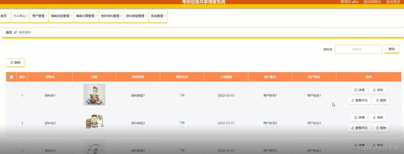 考研资料管理:在考研资料管理页面,可以查看资料名、封面、资料类型、资料文件、上传时间、用户账号、用户姓名等内容,还能进行详情,删除等操作,如图5-6所示: