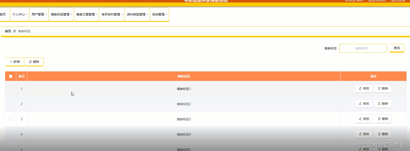 博客标签管理:在博客标签管理页面,可以新增博客标签等内容,还能对博客标签管理进行修改、删除等操作,如图5-4所示: