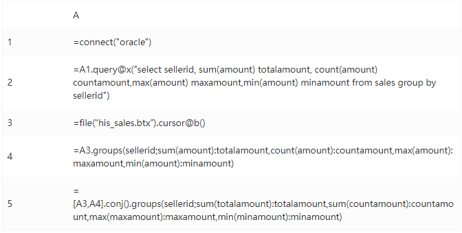 将历史数据存储在文件后与生产库混合查询,历史数据使用游标可以支持大数据场景,A4针对文件游标进行分组汇总,A5归并数据并汇总分组结果。这里使用了SPL提供的二进制集文件(btx),相对文本更加高效。集文件采用了压缩技术(占用空间更小读取更快),存储了数据类型(无需解析数据类型读取更快),支持可追加数据的倍增分段机制,利用分段策略很容易实现并行计算,保证计算性能。