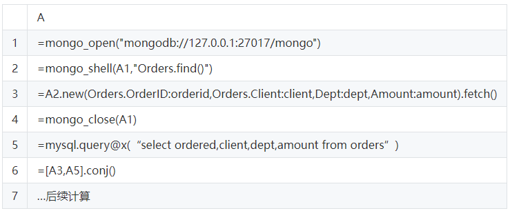 除了RDB,对于有些场景涉及的NoSQL、Hadoop等数据源也能支持,SPL具备多源混算能力,无论基于何种数据源都可以进行混合查询实现T+0。比如MongoDB与MySQL混合查询: