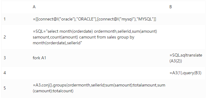 本例中,Oracle作为生产库存储当期热数据,MySQL存储历史冷数据。前端传入一句标准SQL(A2),再借助SPL的转换功能将标准SQL转换成对应数据库的语法(B3)并发给数据库查询(B4),最后归并结果进行最后的汇总运算(A5)。这里使用了多线程并行方式(A3)同时执行两个SQL,效率更高。