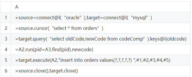 SPL的计算能力还能用于ETL,将生产数据转移到历史库中,还经常伴随一些转换计算,这些都可以使用SPL来完成。比如出于某些原因,要将生产数据某些编码字段通过某个对照表转换成另一种编码(遵守一致性的编码规则、整理数据类型获得更好性能等),而对照表通常并不会存在生产库中,而不能直接在生产库中计算好,这就涉及多数据源计算了。