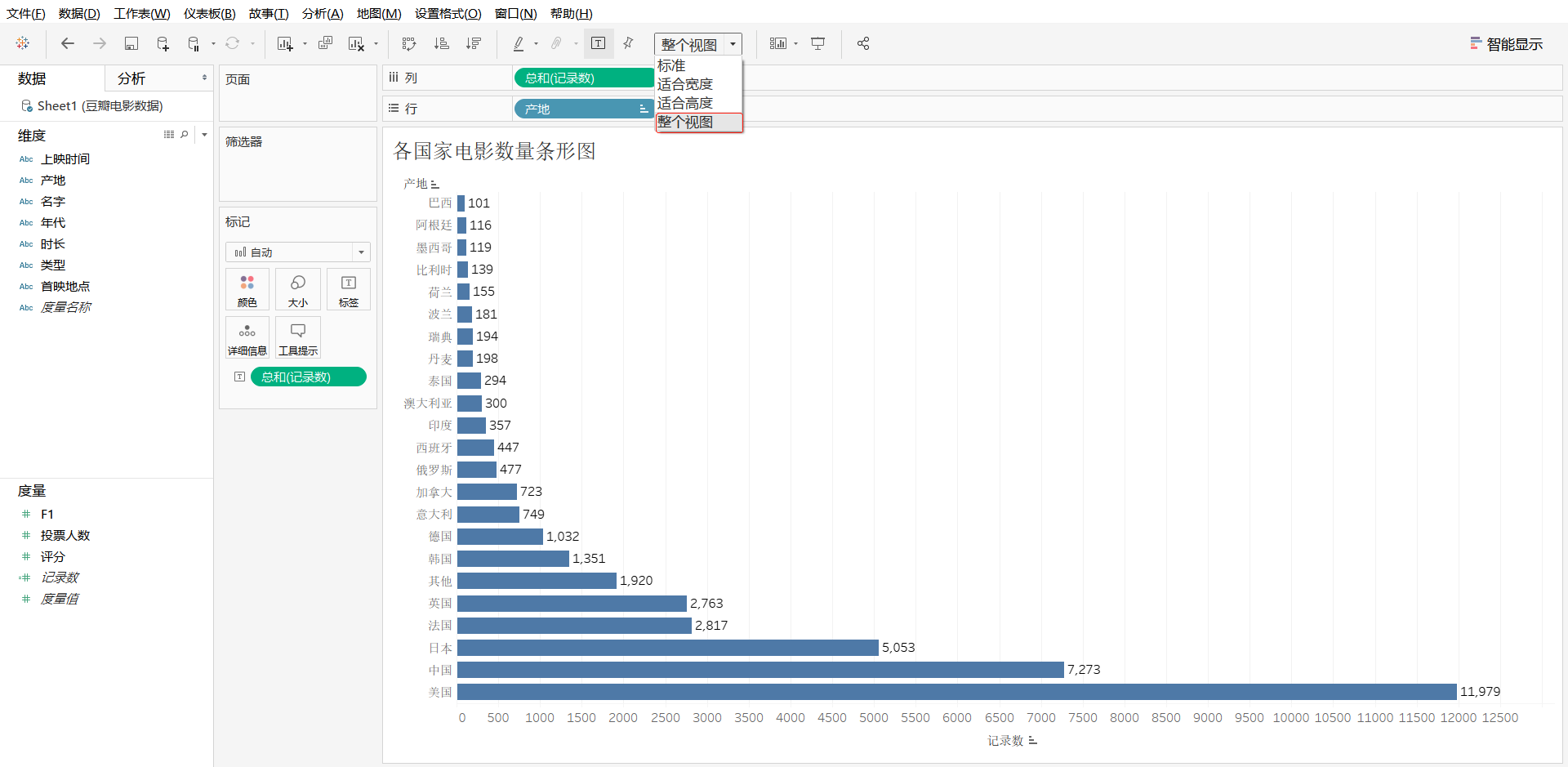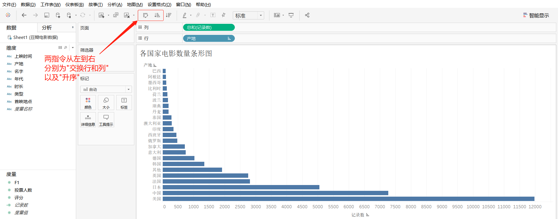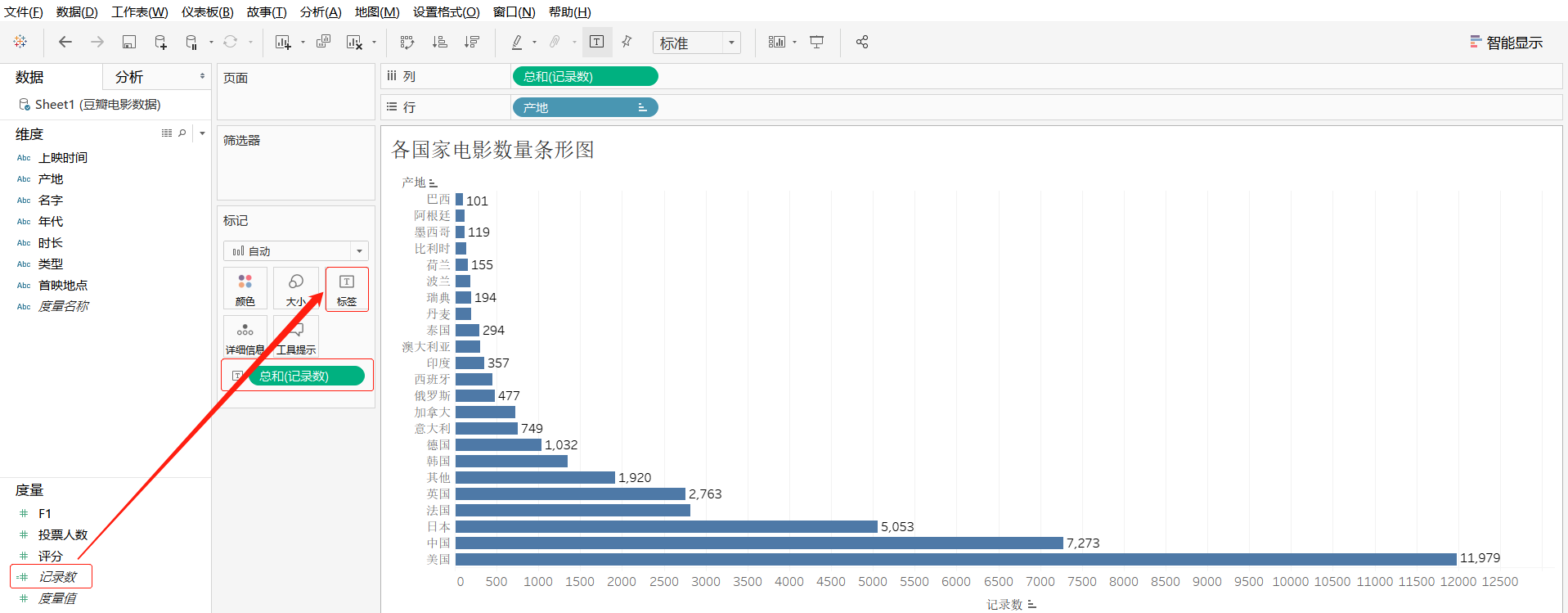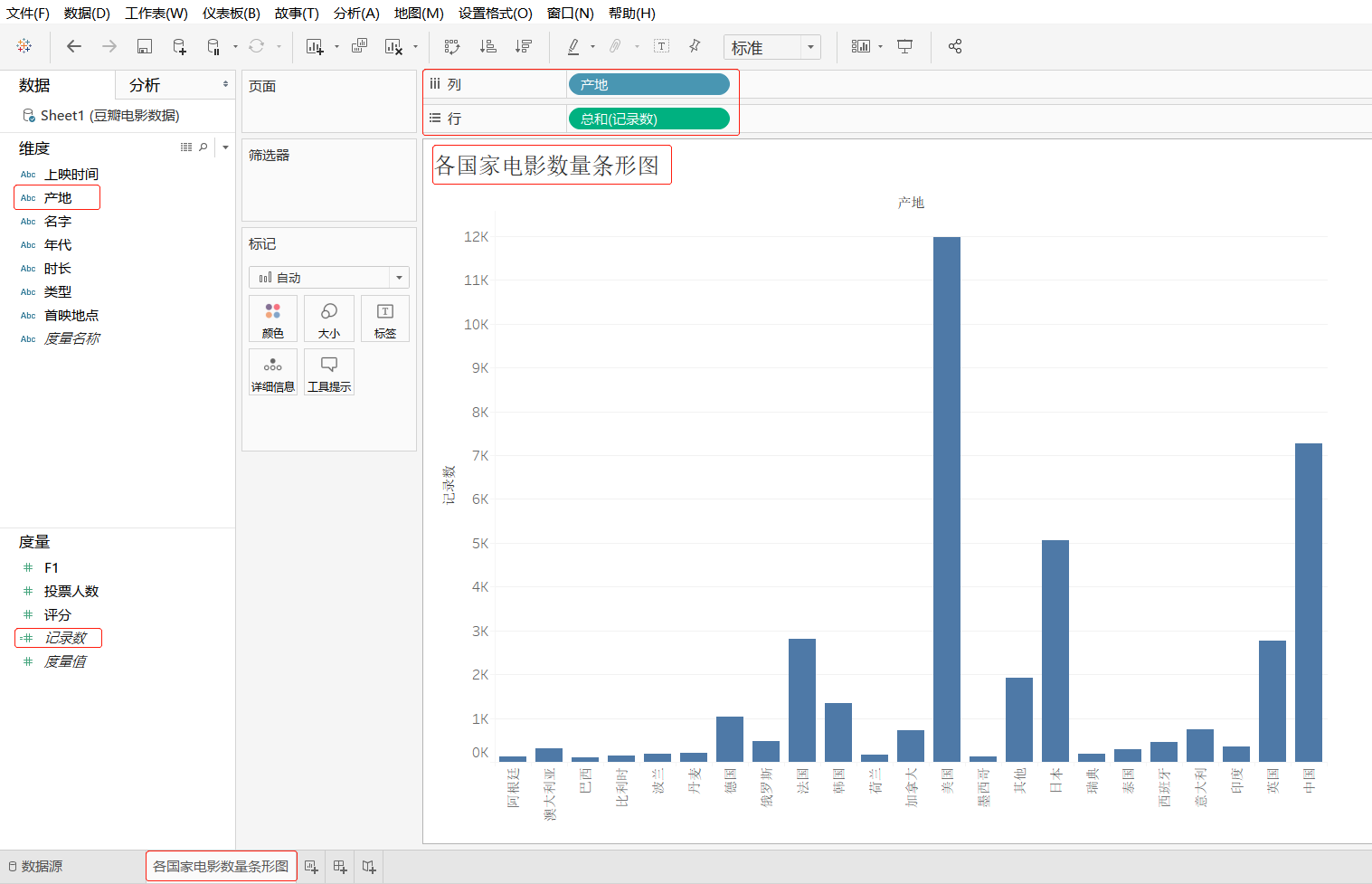 步骤2:新建工作表,将其工作表命名为"各国家电影数量条形图",将维度"产地"字段拖曳至"列"功能区,将度量"记录数"字段拖曳至"行"功能区中