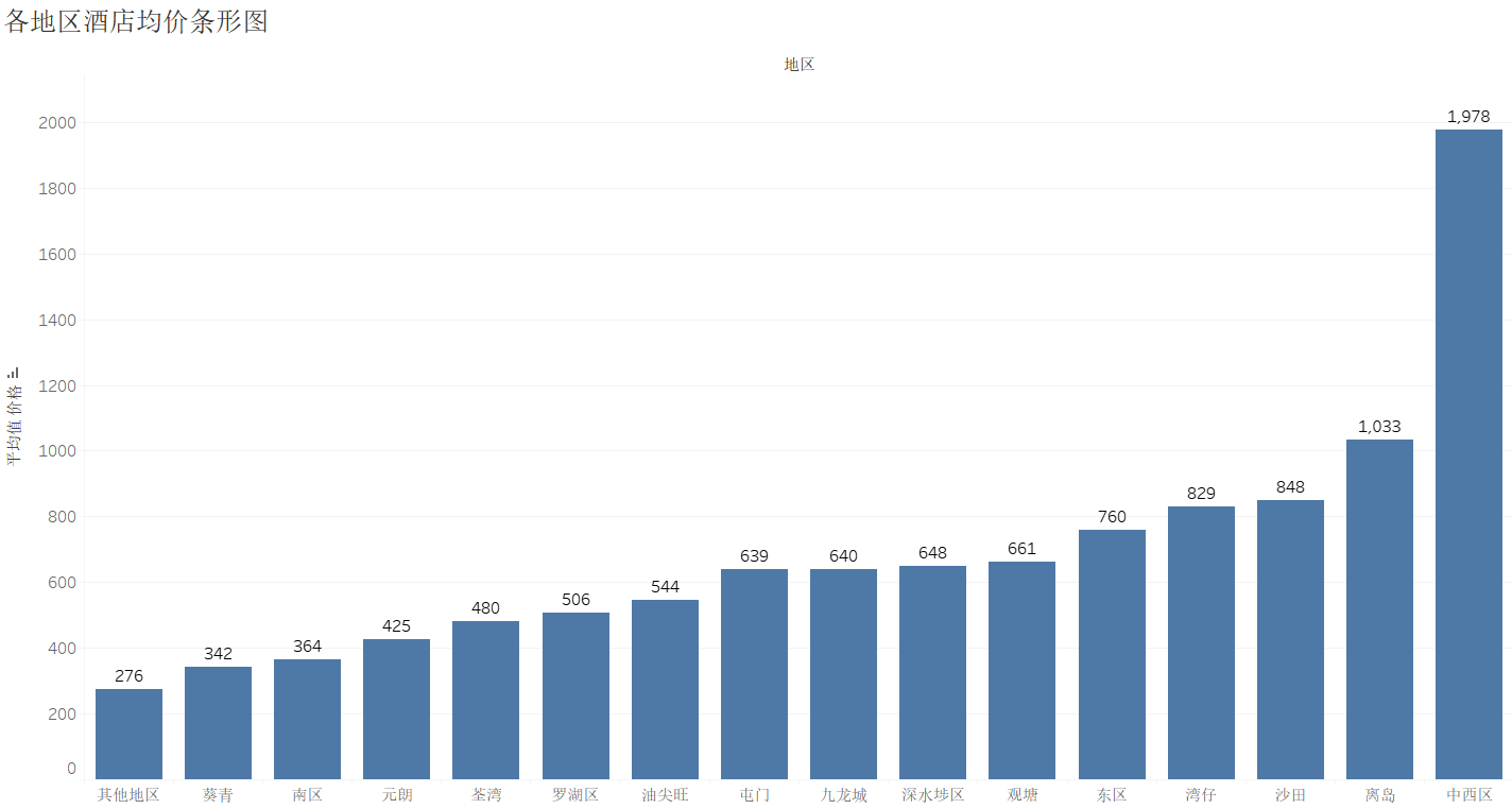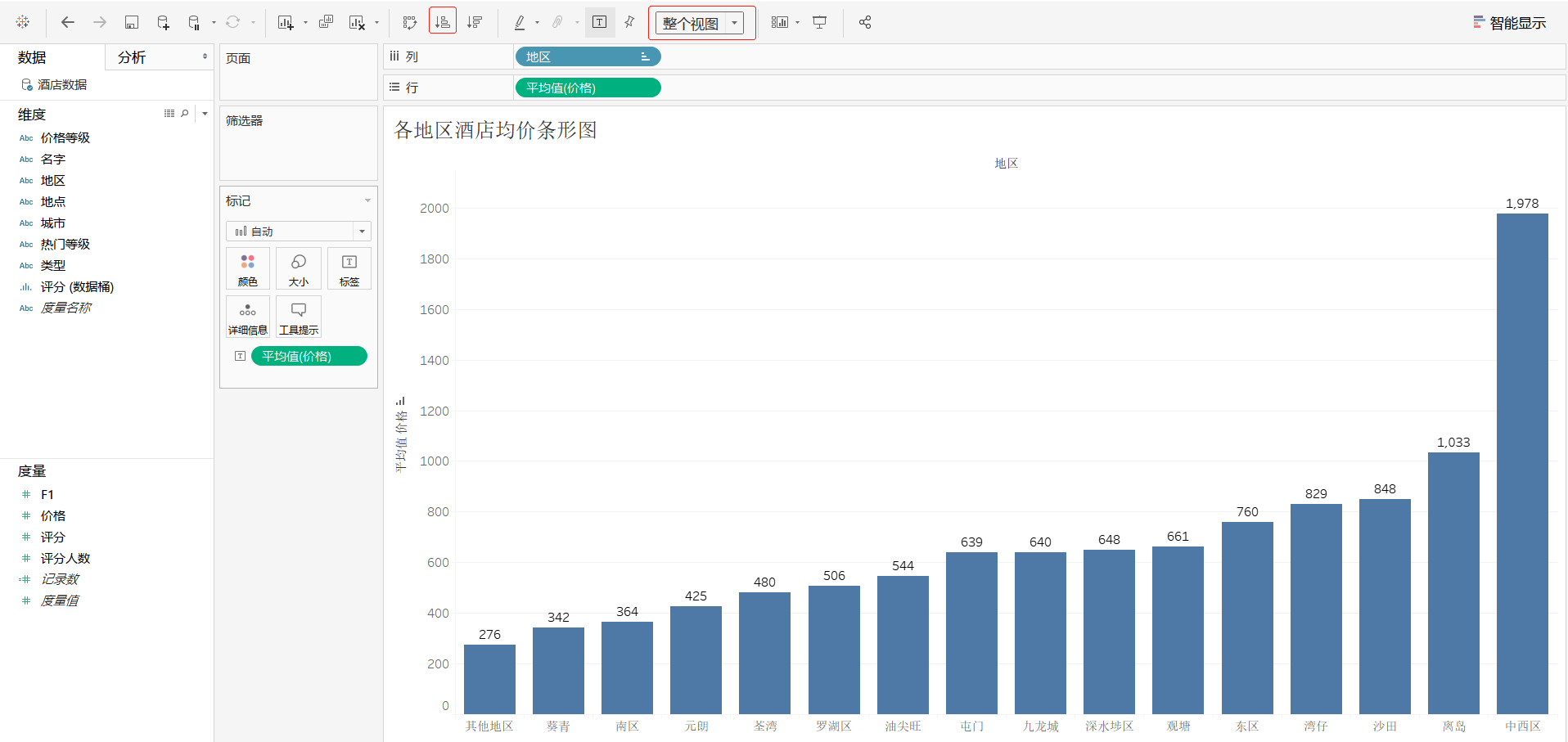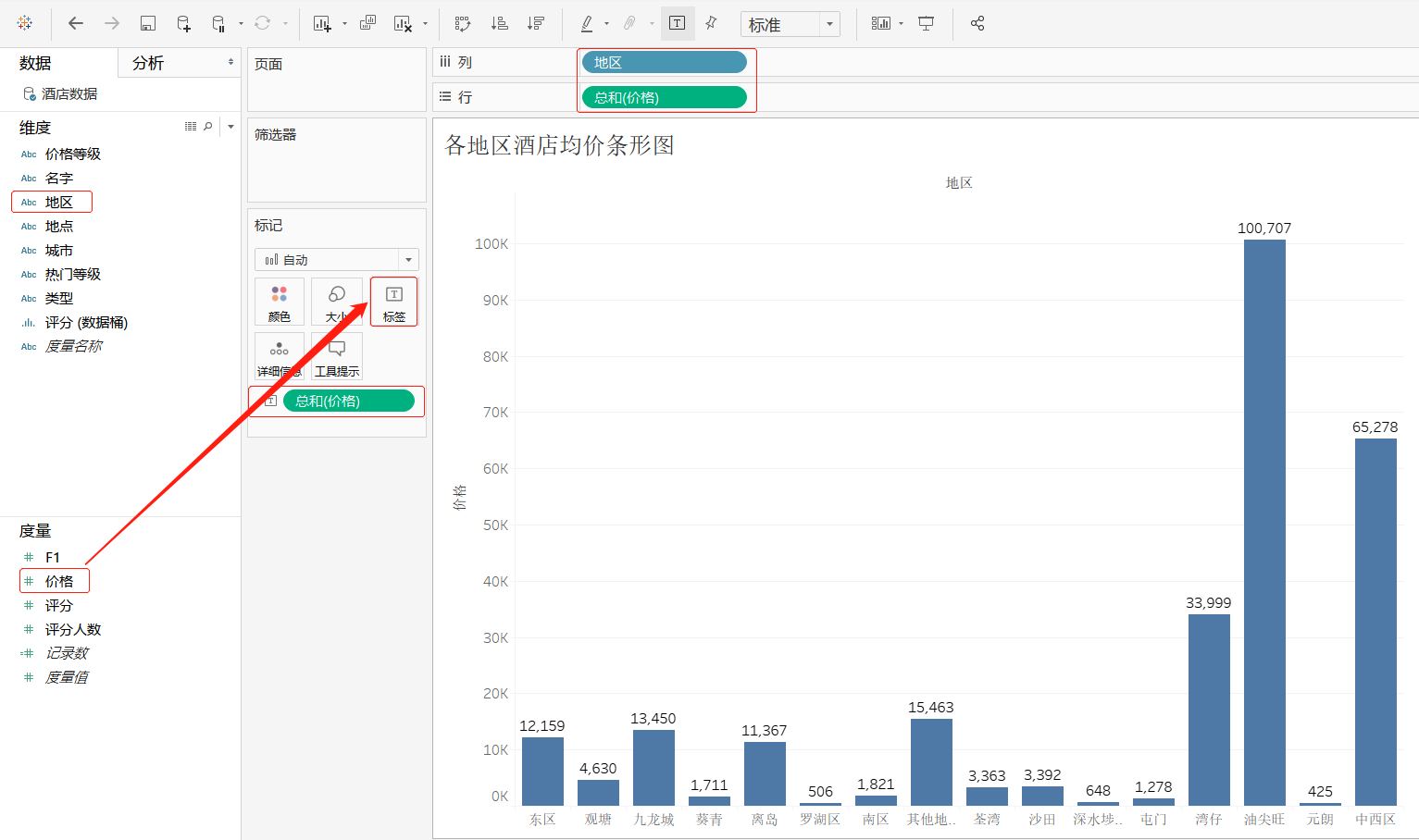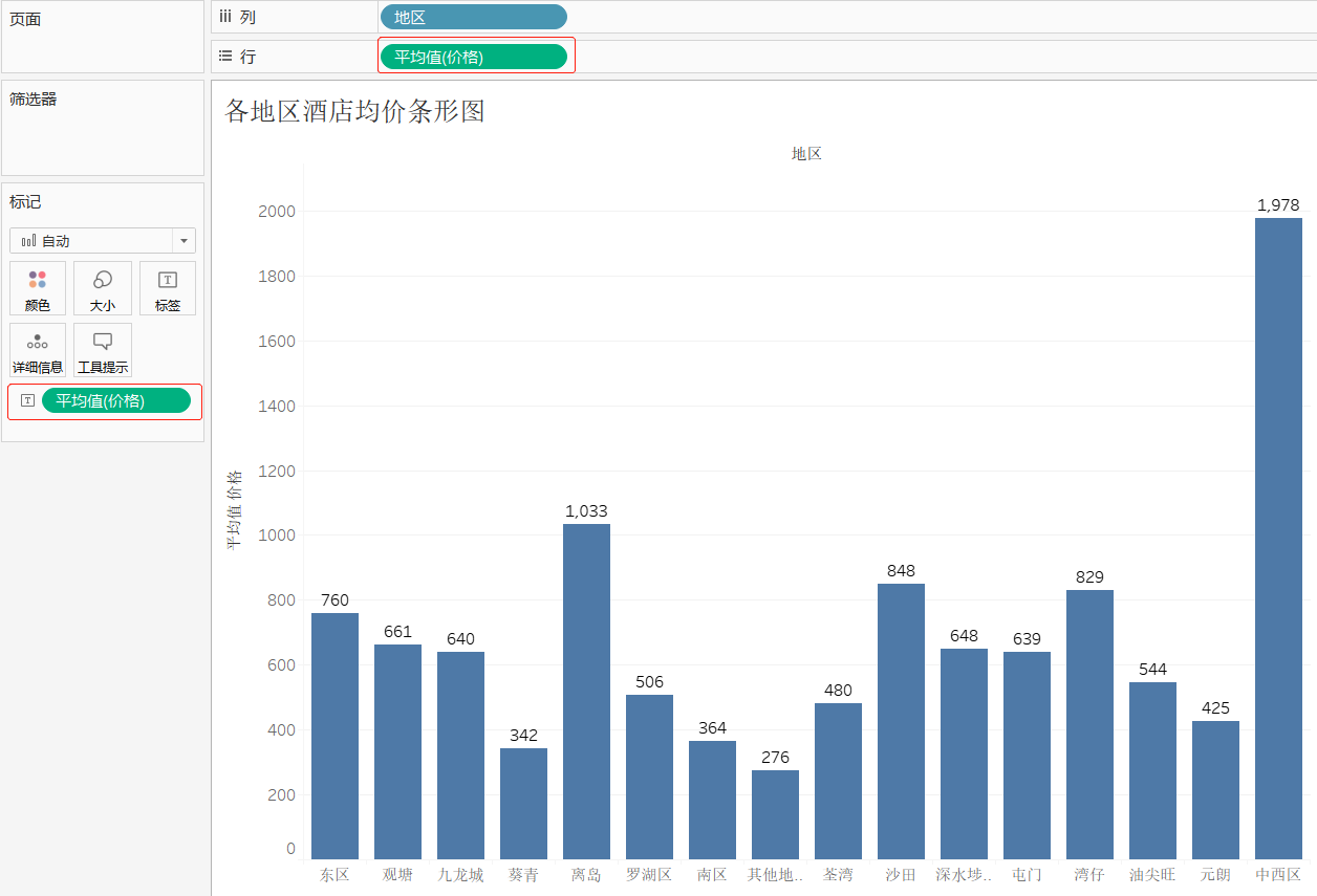步骤2:新建工作表,将其工作表命名为"各地区酒店均价条形图",将维度"地区"字段拖曳至"列"功能区,将度量"价格"字段拖曳至"行"功能区以及标记卡中的"标签"选项