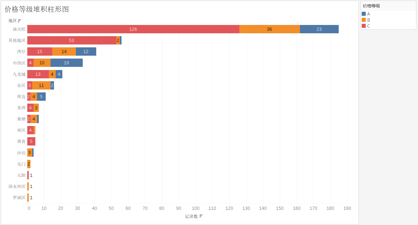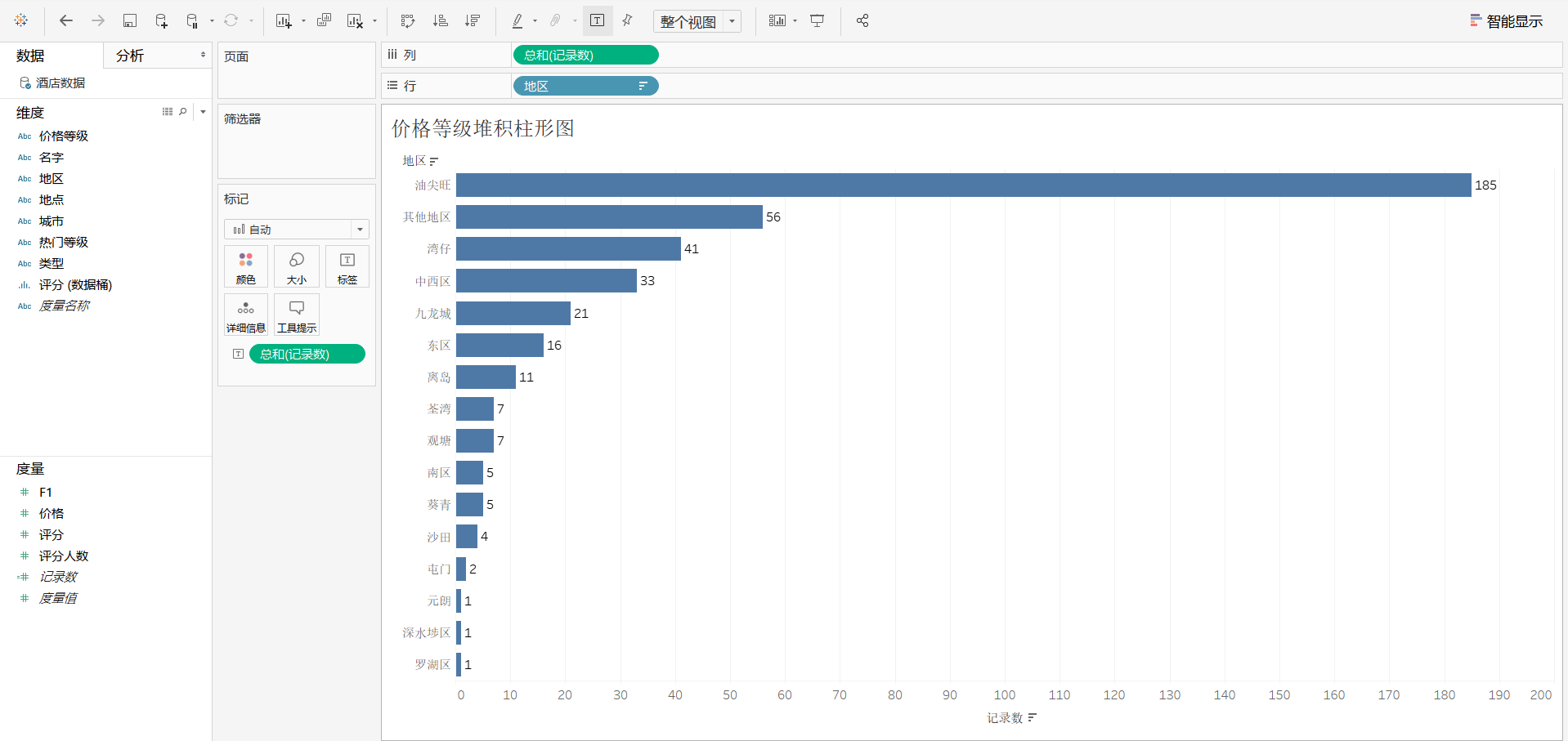 步骤3:新建工作表,将其工作表命名为"价格等级堆积柱形图",将维度"地区"字段拖曳至"行"功能区,将度量"记录数"字段拖曳至"列"功能区以及标记卡中的"标签"选项,点击【降序】按钮,然后选择"整个视图"选项
