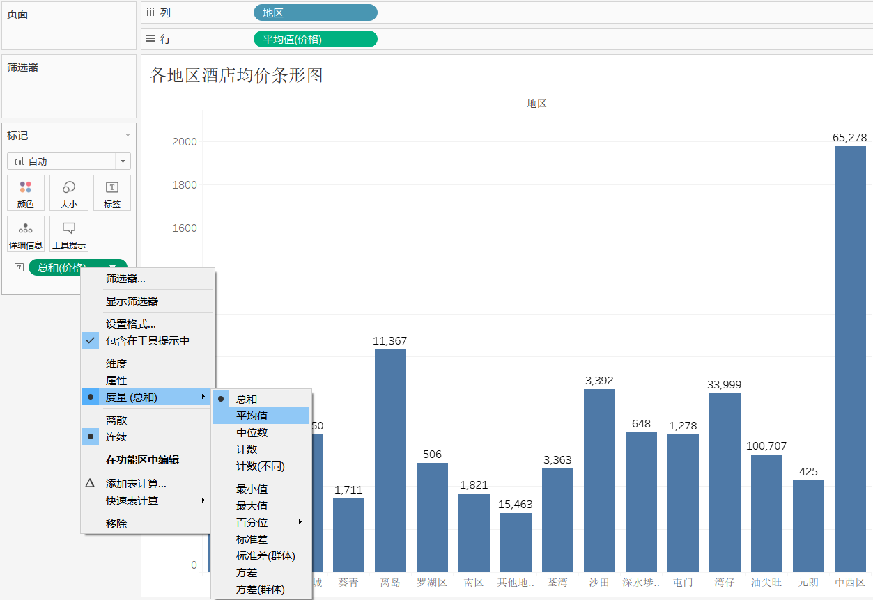 同理对标记卡内的"价格"字段鼠标右键,将"总和"更换为"平均值"