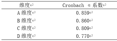 从上表可以看出,A,B,C,D四个维度的α系数值均高于0.7,最小是D维度的信度系数为0.770,所以说明本次数据的信度质量水平较好,研究数据真实可靠。