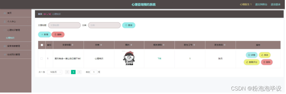 心理知识管理,在心理知识管理页面可以对索引、文章标题、分类、图片、相关资料、医生工号、医生姓名等信息进行详情、修改、查看评论或删除等操作,如图5-18所示。