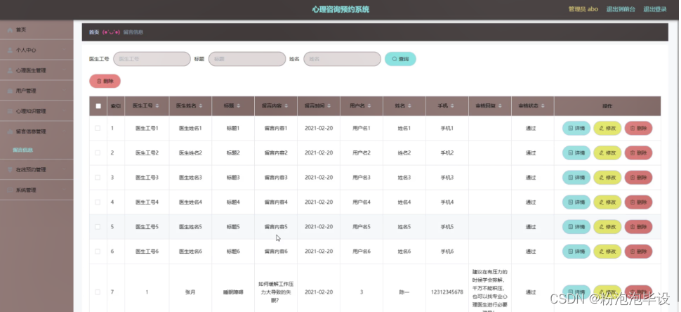留言信息管理,在留言信息管理页面可以对索引、医生工号、医生姓名、标题、留言内容、留言时间、用户名、姓名、手机、审核回复、审核状态等信息进行详情、修改或删除等操作,如图5-6所示。