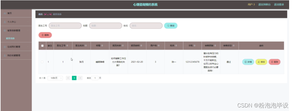 留言信息管理,在留言信息管理页面可以对索引、医生工号、医生姓名、标题、留言内容、留言时间、用户名、姓名、手机、审核回复、审核状态等信息进行详情,修改或删除等操作,如图5-12所示。