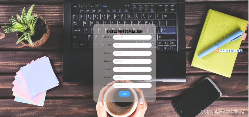 医生注册,在医生注册页面可以填写医生工号、密码、医生姓名、联系电话、个人简介、坐诊地址、坐诊时间等内容进行注册操作,如图5-15所示。