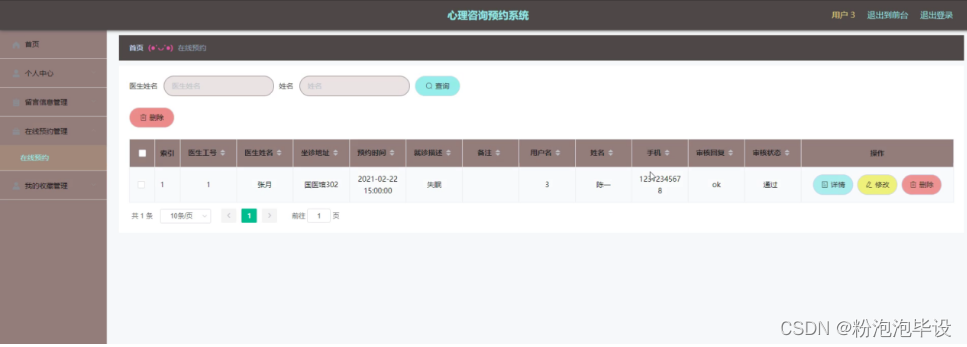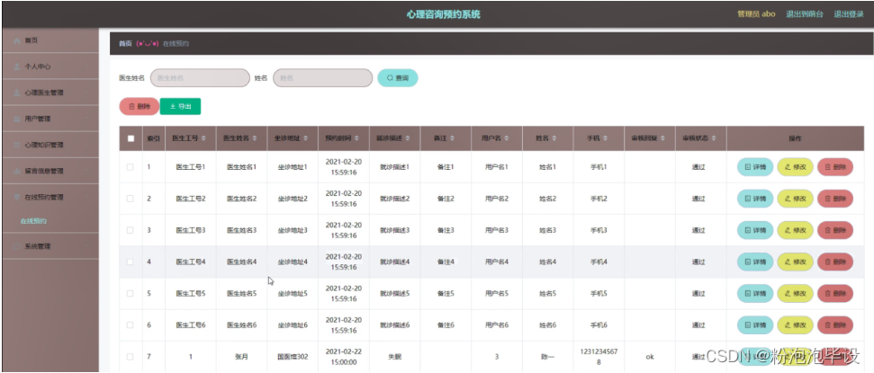 在线预约管理,在在线预约管理页面可以对索引、医生工号、医生姓名、坐诊地址、预约时间、就诊描述、备注、用户名、姓名、手机、审核回复、审核状态等信息进行详情、修改或删除等操作,如图5-7所示。