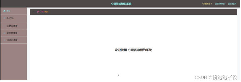 心理医生登录进入系统可以查看首页、个人中心、心理知识管理、留言信息管理、在线预约管理等内容,如图5-16所示。