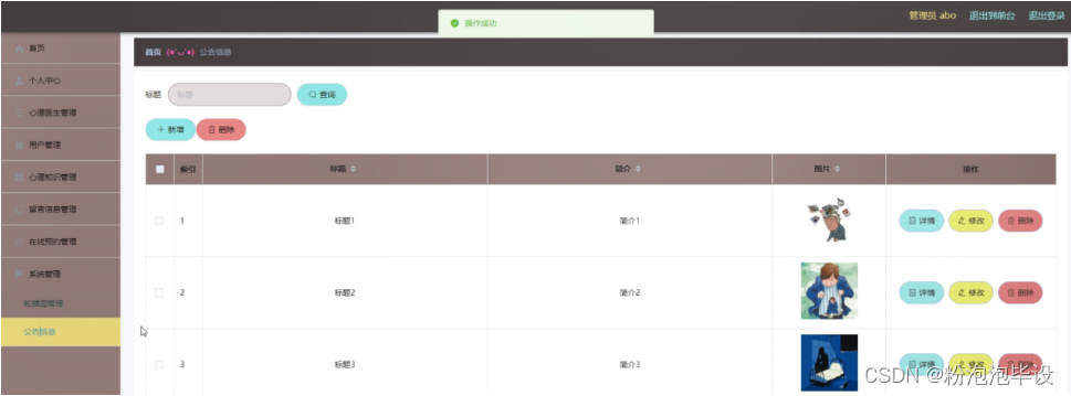 系统管理,在公告信息页面可以对索引、标题、简介、图片等信息进行详情,修改或删除等操作,还可以根据需要轮播图管理进行相应操作;如图5-14所示。