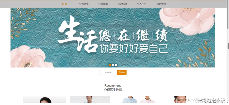 心理咨询预约系统设计,在心理咨询预约系统首页可以查看首页、心理医生、心理知识、公告信息、个人中心、后台管理等内容,如图5-1所示。