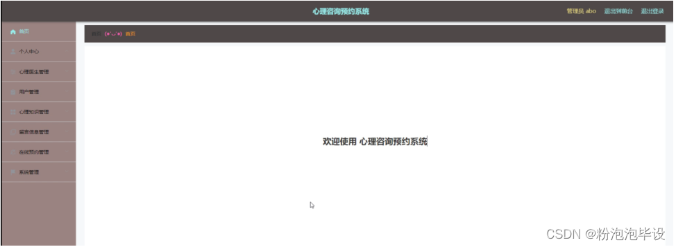 管理员登录进入心理咨询预约系统设计可以查看首页、个人中心、心理医生管理、用户管理、心理知识管理、留言信息管理、在线预约管理、系统管理等内容进行详细操作,如图5-9所示。