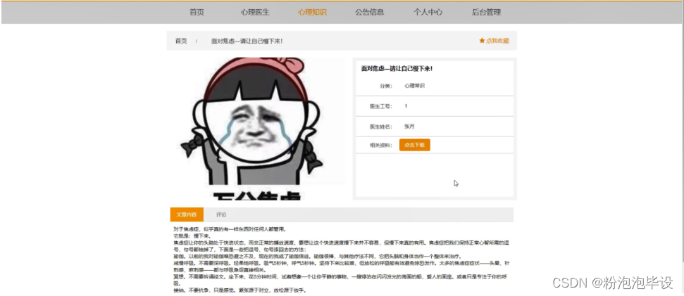 心理知识,在心理知识页面可以查看文章标题、分类、图片、相关资料、医生工号、医生姓名、文章内容等详细信息,根据需要进行评论或收藏,如图5-4所示。