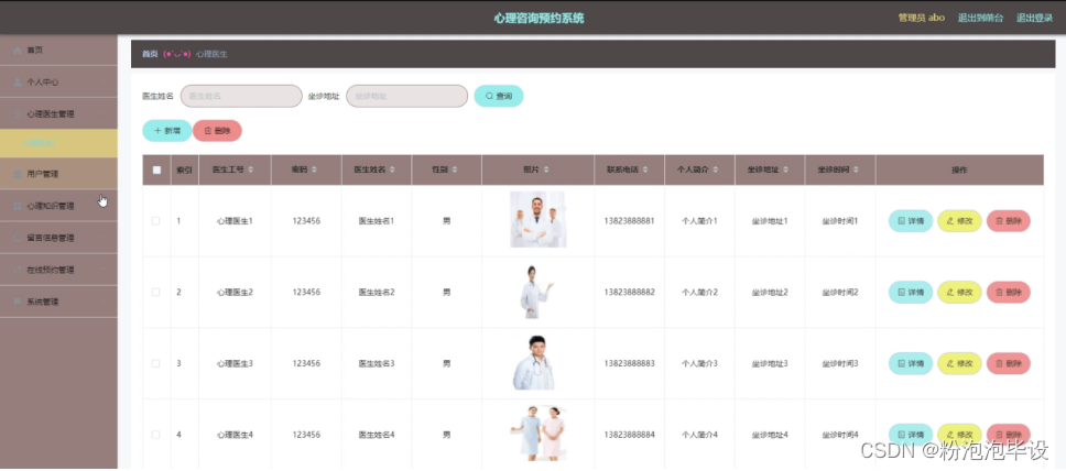 心理医生管理,在心理医生管理页面可以对索引、医生工号、密码、医生姓名、性别、照片、联系电话、个人简介、坐诊地址、坐诊时间等信息进行详情,修改或删除等操作,如图5-10所示。