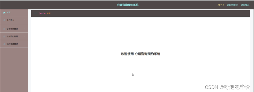 用户登录进入心理咨询预约系统可以查看首页、个人中心、留言信息管理、在线预约管理、我的收藏管理等内容,如图5-5所示。