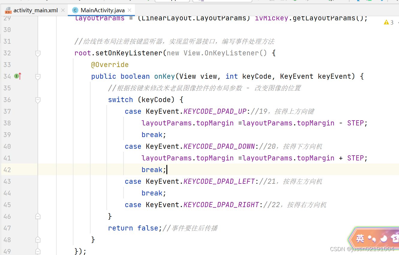 - 给线性布局注册按键监听器,实现监听器接口,编写事件处理方法