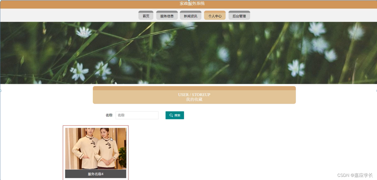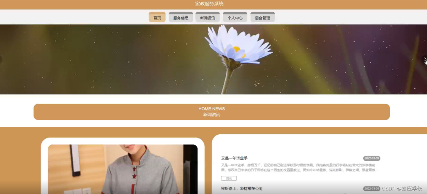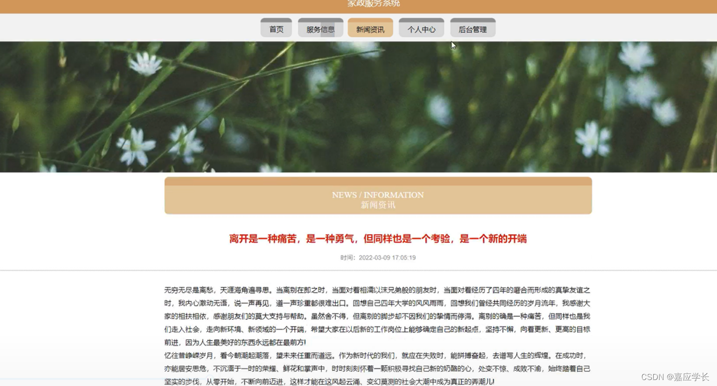 网站首页页面主要包括首页、服务信息、新闻资讯、个人中心、后台管理等内容,并根据需要进行详细操作;如图5-1所示: