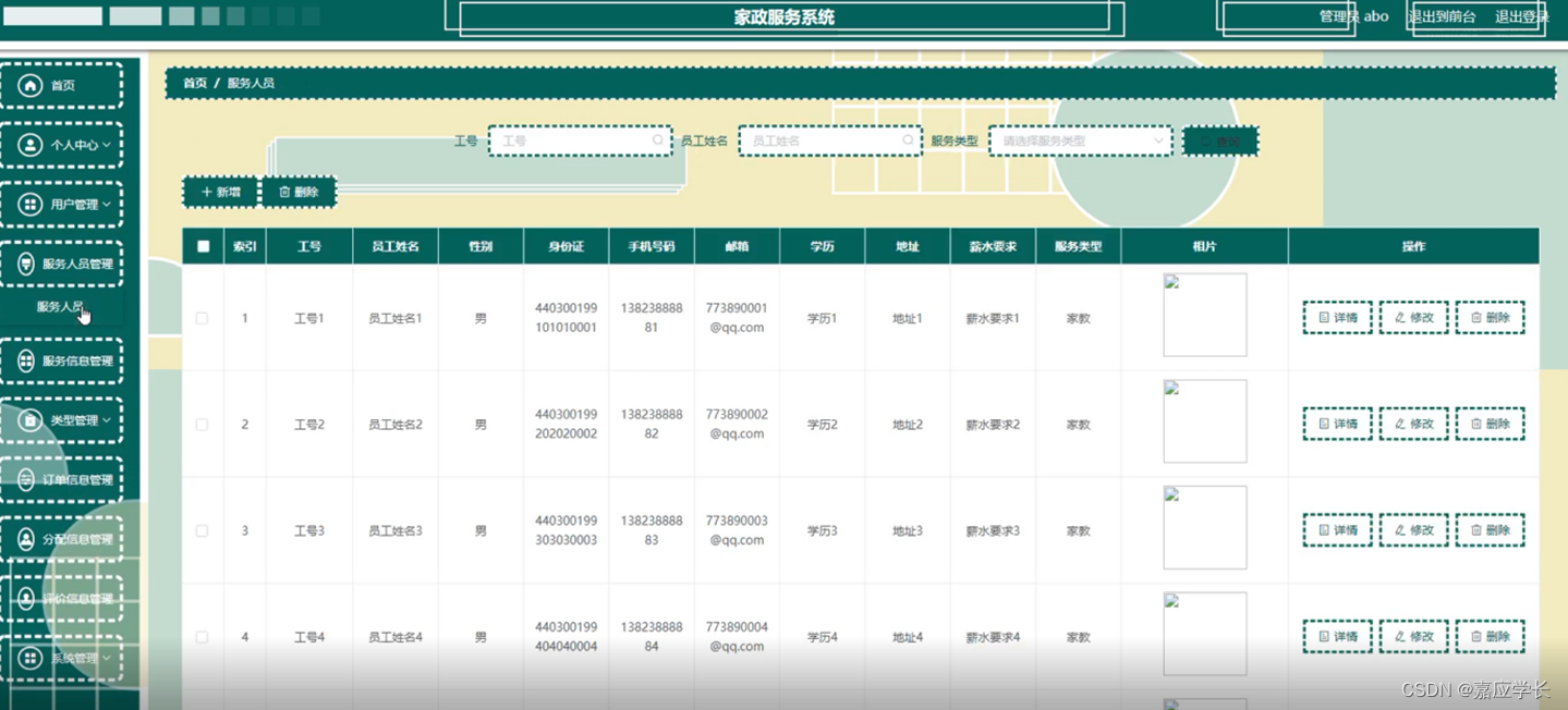 服务人员管理,在服务人员管理页面可以对工号、员工姓名、性别、身份证、手机号码、邮箱、学历、地址、薪水要求、服务类型、相片等内容进行详情、修改、删除等操作,如图5-11所示。