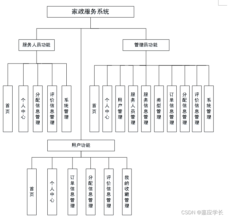 这些功能可以充分满足家政服务系统的需求。此系统功能较为全面如下图系统功能结构如图4-1所示。
