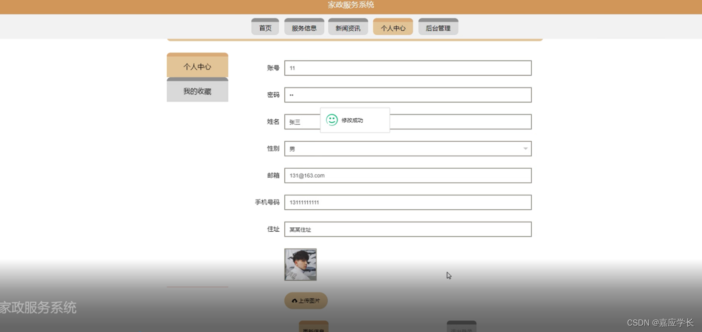 个人中心,在个人信息页面通过填写账号、密码、姓名、性别、邮箱、手机号码、住址、相片等信息进行更新信息,还可以根据需要对我的收藏进行相对应操作,如图5-6 5-7所示。