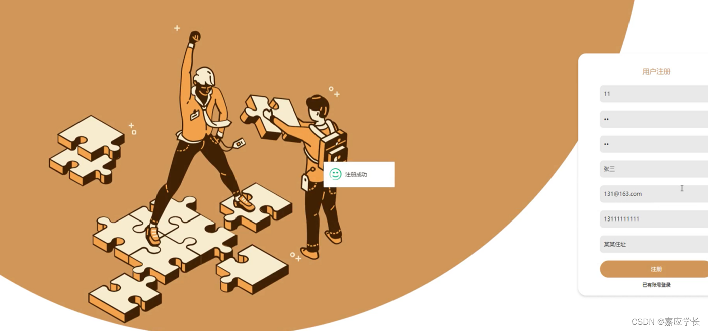 用户注册,在用户注册页面通过填写账号、密码、确认密码、姓名、邮箱、手机号码、住址等信息完成用户注册操作,如图5-2所示。