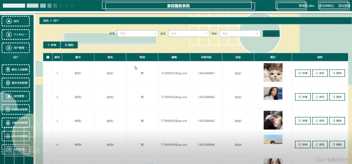 用户管理,在用户管理页面可以对账号、姓名、性别、邮箱、手机号码、住址、相片等内容进行详情、修改和删除等操作,如图5-10所示。