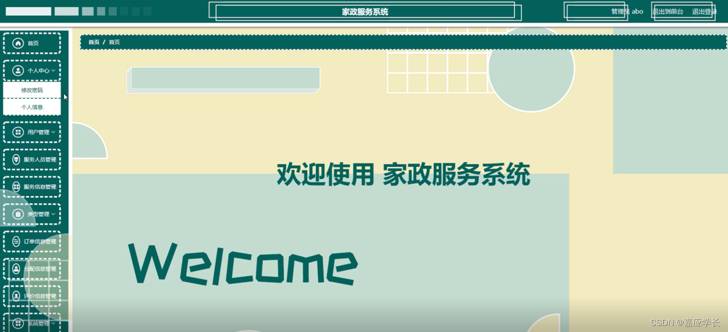 管理员登录系统后,可以对首页、个人中心、用户管理、服务人员管理、服务信息管理、类型管理、订单信息管理、分配信息管理、评价信息管理、系统管理等进行相应的操作管理,如图5-9所示。