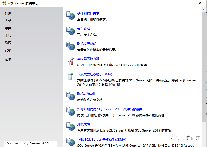 选择安装(左边),点击“全新 SQL Server独立安装或向现有安装添加功能”,一路按默认配置安装即可。直到功能选择,选择一个“数据库引擎服务”即可,同时选择一下实例根目录。