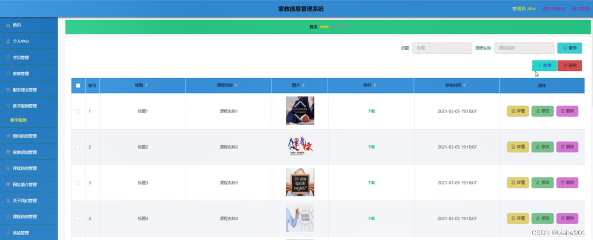 教学案例管理,在教学案例管理页面中可以对索引、标题、课程名称、图片、附件、发布时间等信息进行详情,修改或删除等操作,如图5-11所示。