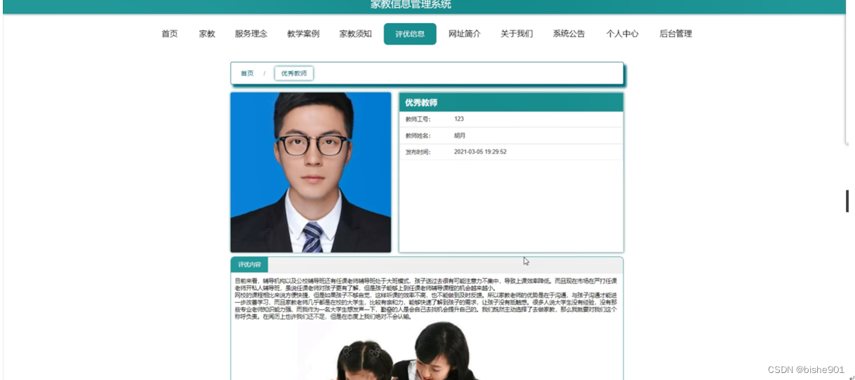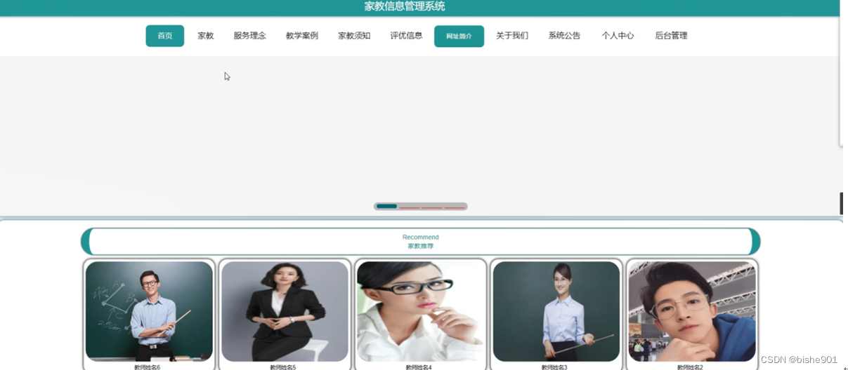 家教中心管理系统,在系统的首页可以查看首页、家教、服务理念、教学案例、家教须知、评优信息、网址简介、关于我们、系统公告、个人中心、后台管理等信息进行操作,如图5-1所示。