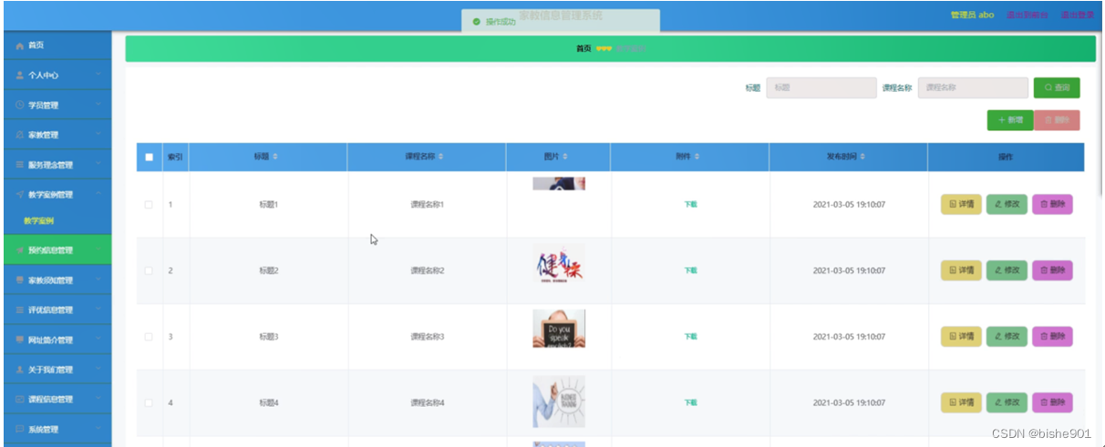 预约信息管理,在预约信息管理页面中可以对索引、标题、课程名称、图片、附件、发布时间等信息进行详情,修改或删除等操作,如图5-12所示。