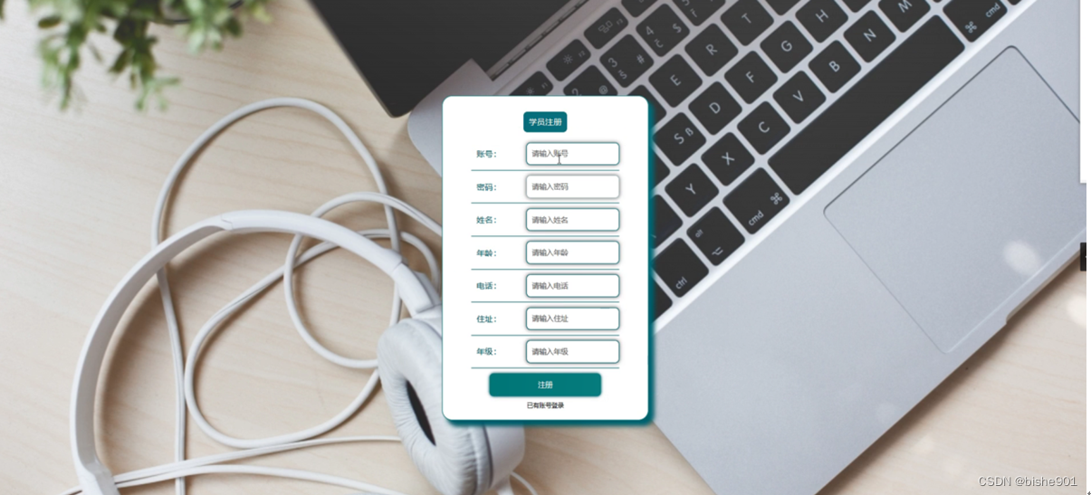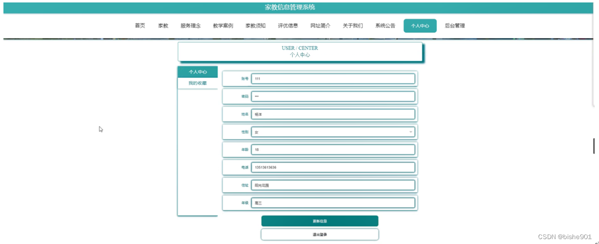 学员注册,在学员注册页面通过填写账号、密码、姓名、年龄、电话、住址、年级等内容并提交即可进行注册,如图5-4所示。在个人中心页面通过填写账号、密码、姓名、性别、年龄、电话、住址、年级等内容并提交即可进行信息更新,还可以根据需要对我的收藏进行详细操作;如图5-5所示。