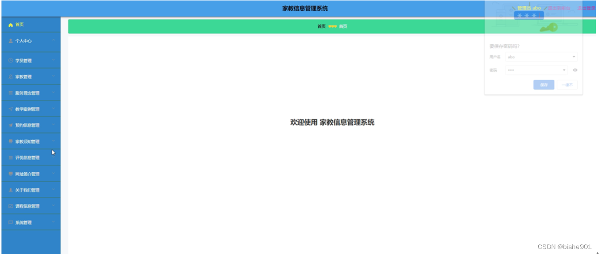 管理员登录进入家教中心管理系统后可以查看首页、个人中心、学员管理、家教管理、服务理念管理、教学案例管理、预约信息管理、家教须知管理、评优信息管理、网址简介管理、关于我们管理、课程信息管理、系统管理等内容进行详细操作,如图5-7所示。