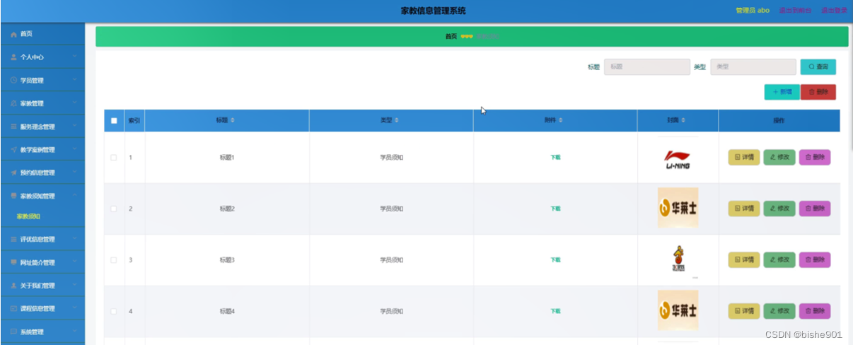家教须知管理,在家教须知管理页面中可以对索引、标题、类型、附件、封面等信息进行详情,修改或删除等操作,如图5-13所示。