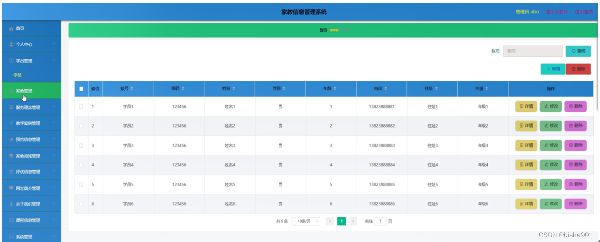 学员管理,在学员管理页面中可以对索引、账号、密码、姓名、性别、年龄、电话、住址、年级等信息进行详情,修改或删除等操作,如图5-8所示。