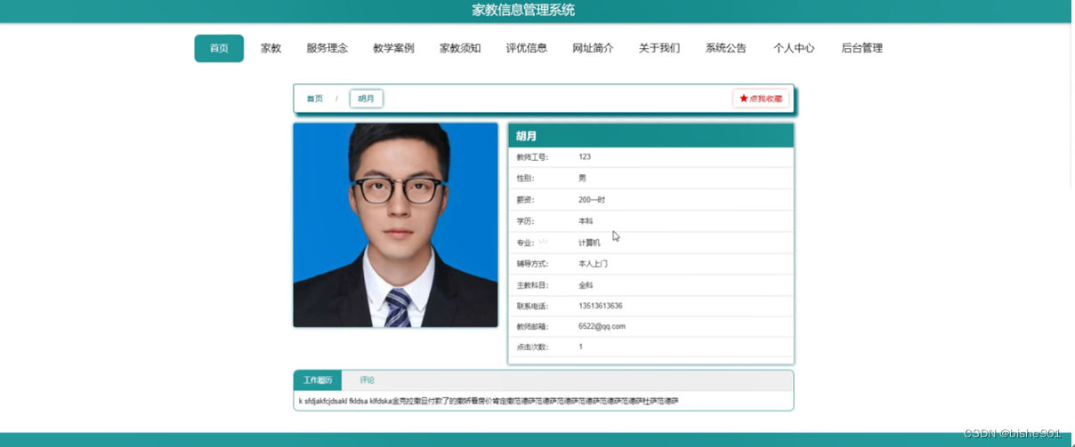 家教,在家教页面中可以查看教师工号、教师姓名、性别、薪资、照片、学历、专业、辅导方式、主教科目、联系电话、教师邮箱、工作履历等信息进行评论或收藏;如图5-2所示。